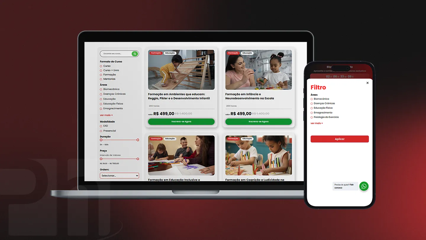 Otimização do Fluxo de Utilizador Simplificámos a jornada para reduzir a fricção e o abandono: Hub → Área Específica → Catálogo Filtrado → Detalhe do Curso → Checkout → WhatsApp