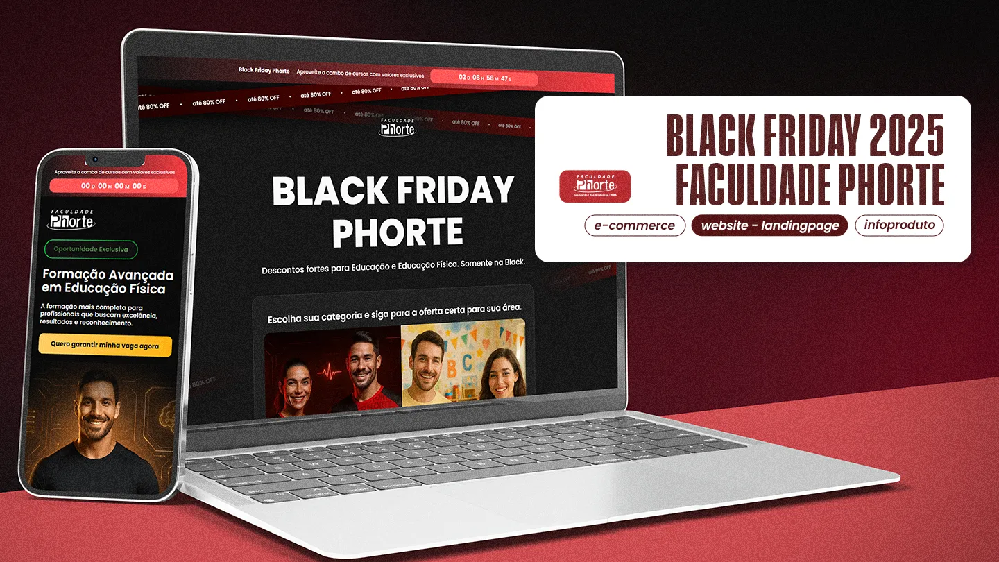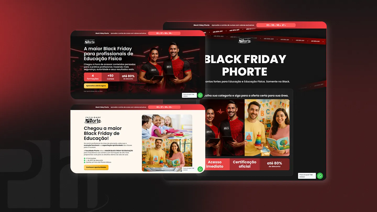 A Black Friday da Faculdade Phorte exigia mais do que apenas páginas promocionais; exigia uma operação digital robusta. O ecossistema anterior era fragmentado: dezenas de cursos e múltiplas áreas (Educação, Educação Física) operavam com estruturas próprias e designs desconexos, dificultando a manutenção e a consistência da marca.