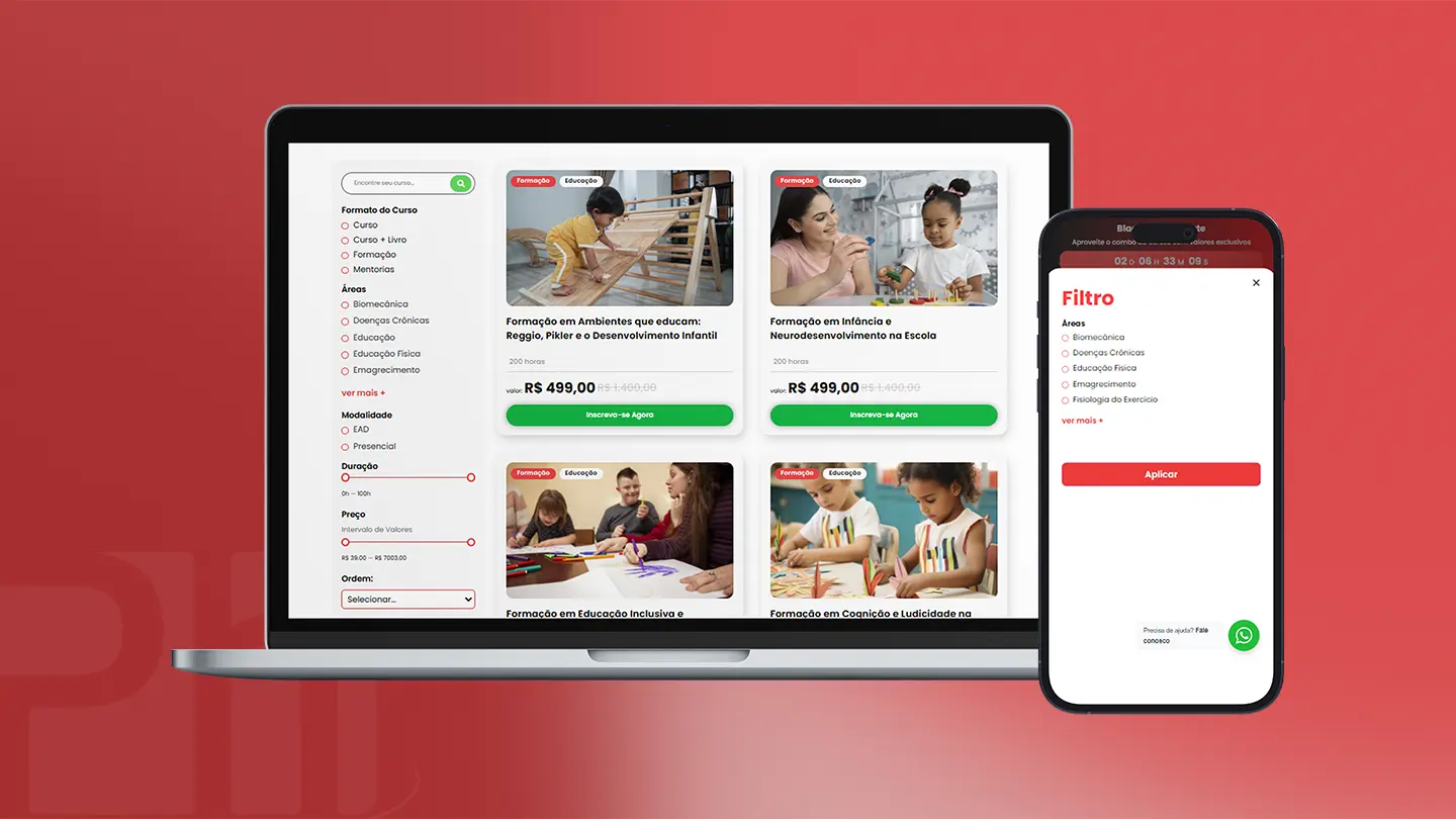 Utilizando o JetSmartFilters, implementamos filtros em tempo real que permitem ao aluno encontrar o curso ideal por: Modalidade, Duração, Área e Preço.