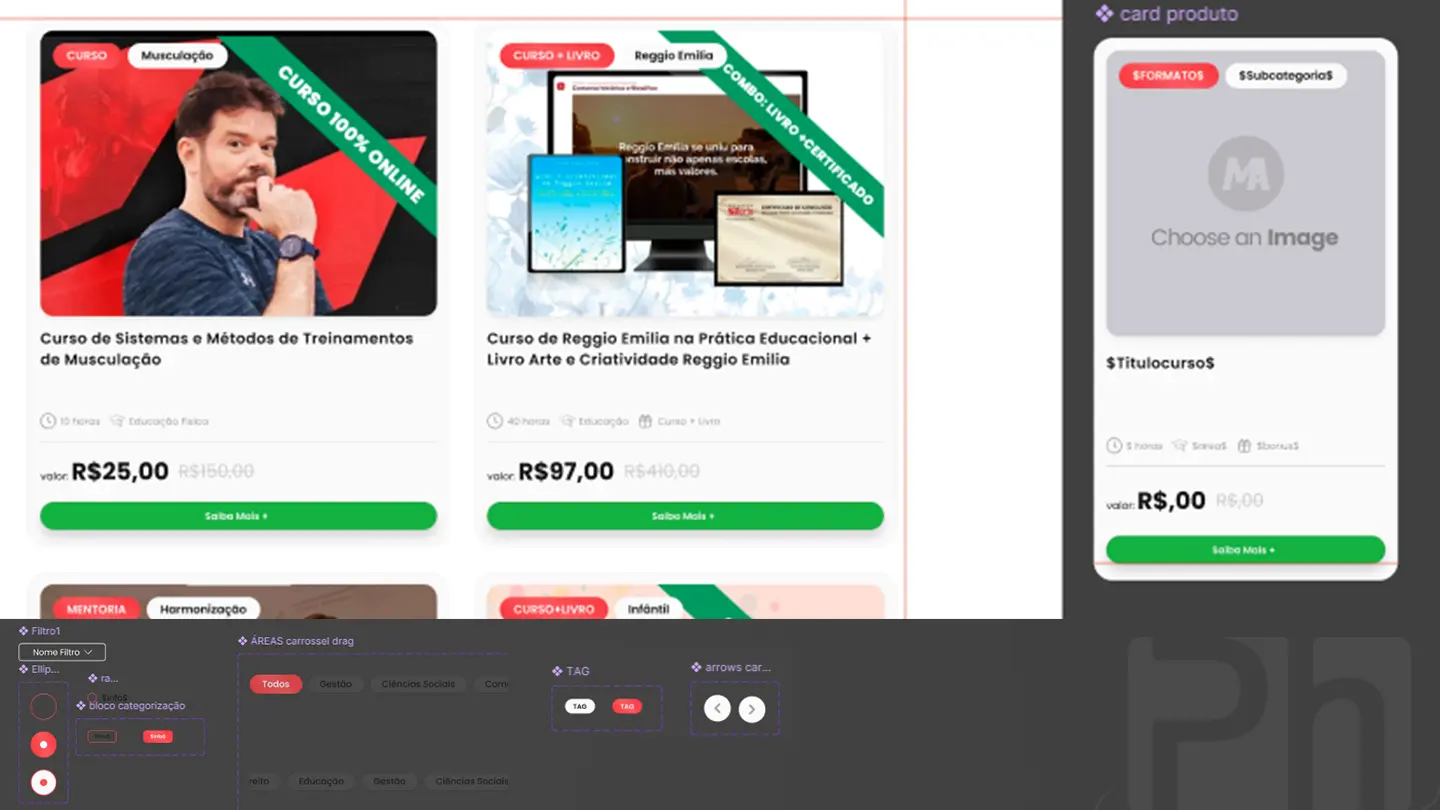 O ganho operacional foi imenso: qualquer novo curso cadastrado no sistema gera esse card automaticamente, sem necessidade de design manual.